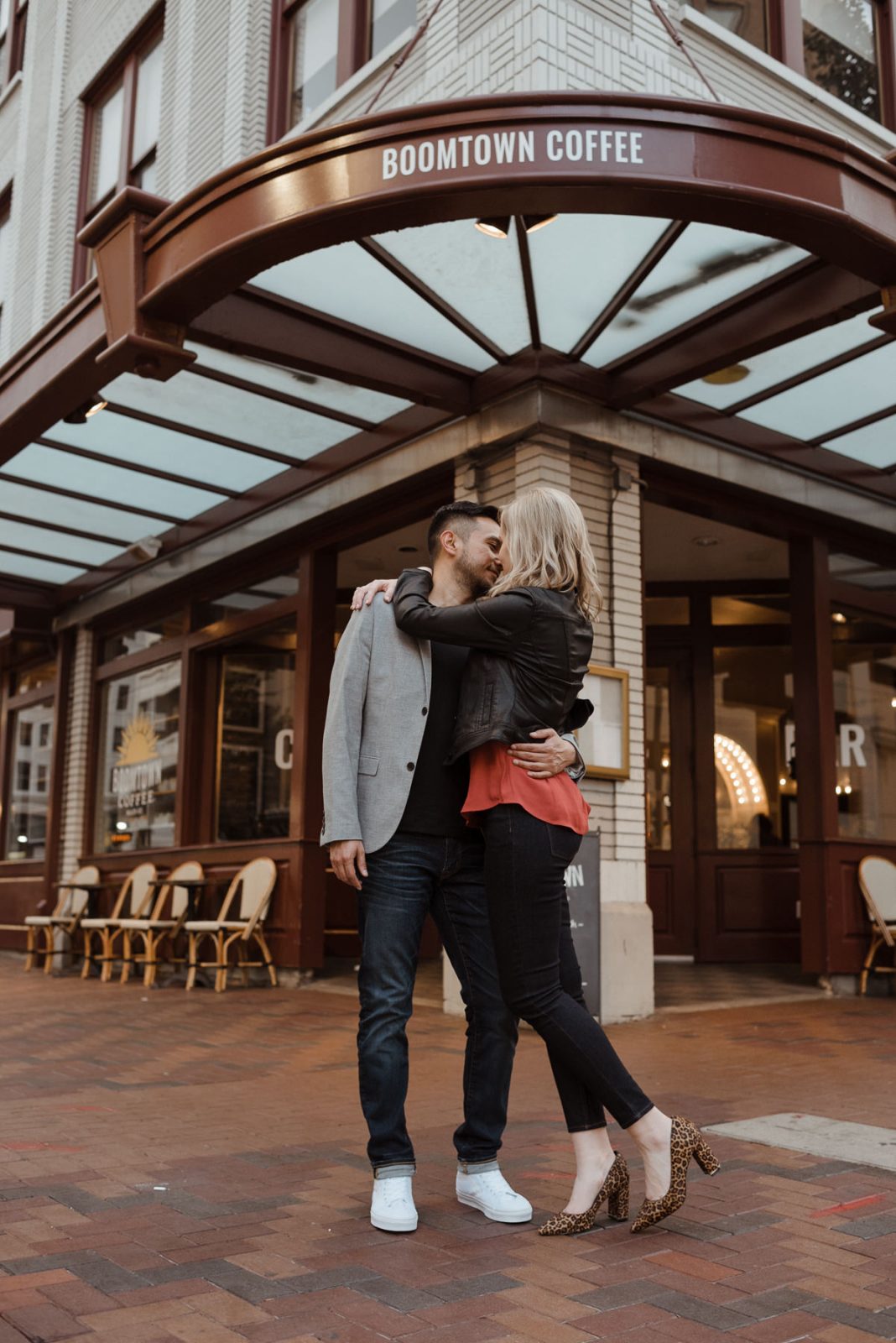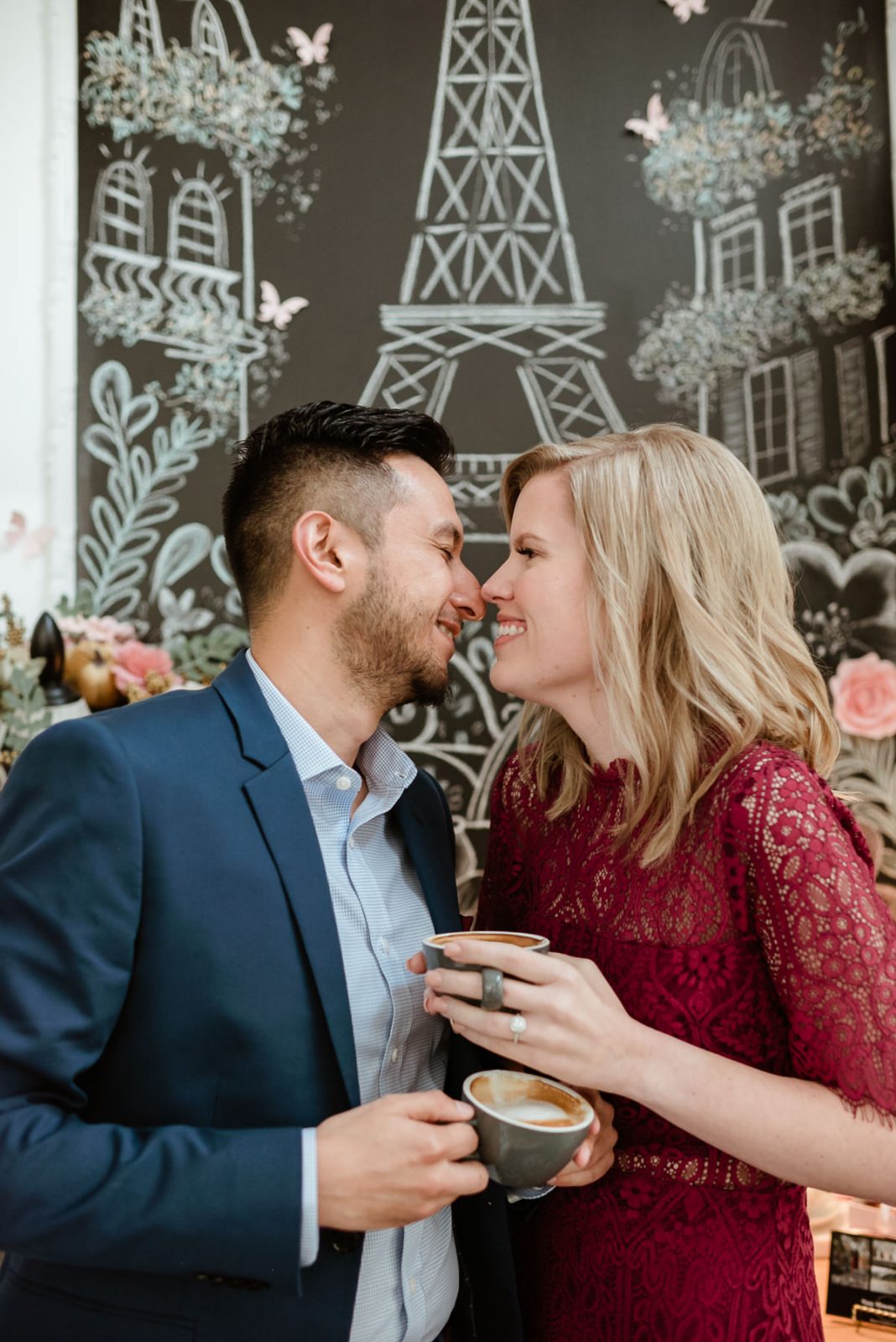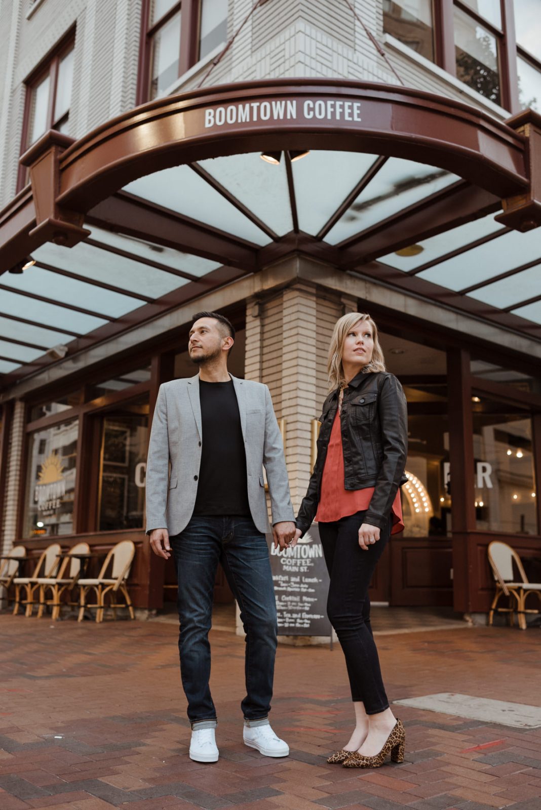 We headed over to a brand new location for Karen and Alfonso’s engagement session, and we totally fell in love with it! Café Poêtes is such a cute spot nestled in Midtown that serves amazing coffee and authentic French pastries. We had so much fun using all the little nooks and corners in the restaurant before heading downtown to finish their session on Main Street. These two were naturals, their session is so natural and fun!